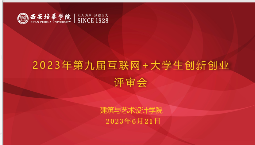 2023年6月21日下午14:00建筑与艺术设计学院第九届“互联网+”大赛院级赛评审会,经过初赛审核,目前有100个项目参加复赛网络评审。担任本次评审的专家为建筑与艺术设计学院教学副院长王虎教授、西安培华学院创新创业导师马江萍副教授,西安培华学院创新创业导师王文佳讲师,参赛项目有高教主赛道、“青年红色筑梦之旅”赛道、职教赛道和萌芽赛道、产业命题赛道等多个类型。