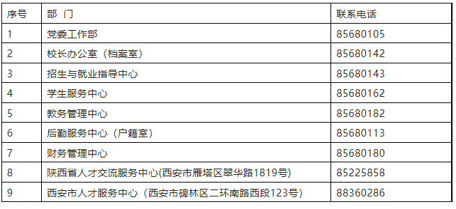 学校各职能部门及陕西省人才服务中心电话如下,如遇相关问题,各位毕业生可电话咨询。