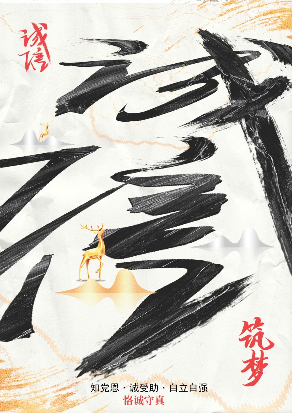 作品介绍:诚,采用了英文单词,信,将单人旁换成了人像,背景使用红色,更加醒目,诚信,是一言既出,驷马难追的心口如一; 诚信,是许人以诺,赴汤蹈火的坦荡风度;诚信,是赠人玫瑰,手留余香的慈悲胸襟。古语云:“反身而诚,乐莫大焉”,又云:“精诚所至,金石为开”。足以看出诚信是一种无价的财富,它无形地存在我们身边。诚信,作为中华民族的传统美德,代代相传,数千年的传承后仍然熠熠生辉。