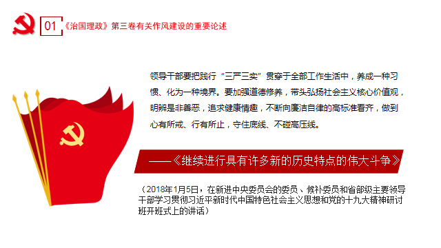 黄老师首先介绍了《治国理政》第三卷有关作风建设的重要论述:“全面从严治党永远在路上,不能有任何喘口气、歇歇脚的念头。我们将继续清除一切侵蚀党的健康肌体的病毒,大力营造风清气正的政治生态,以全党的强大正能量在全社会凝聚起推动中国发展进步的磅礴力量”。