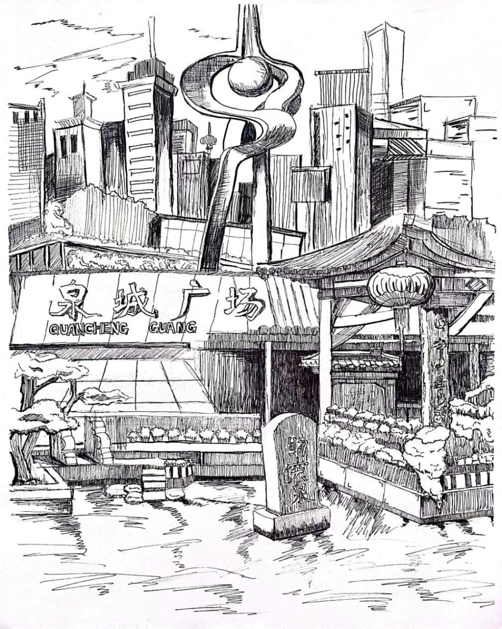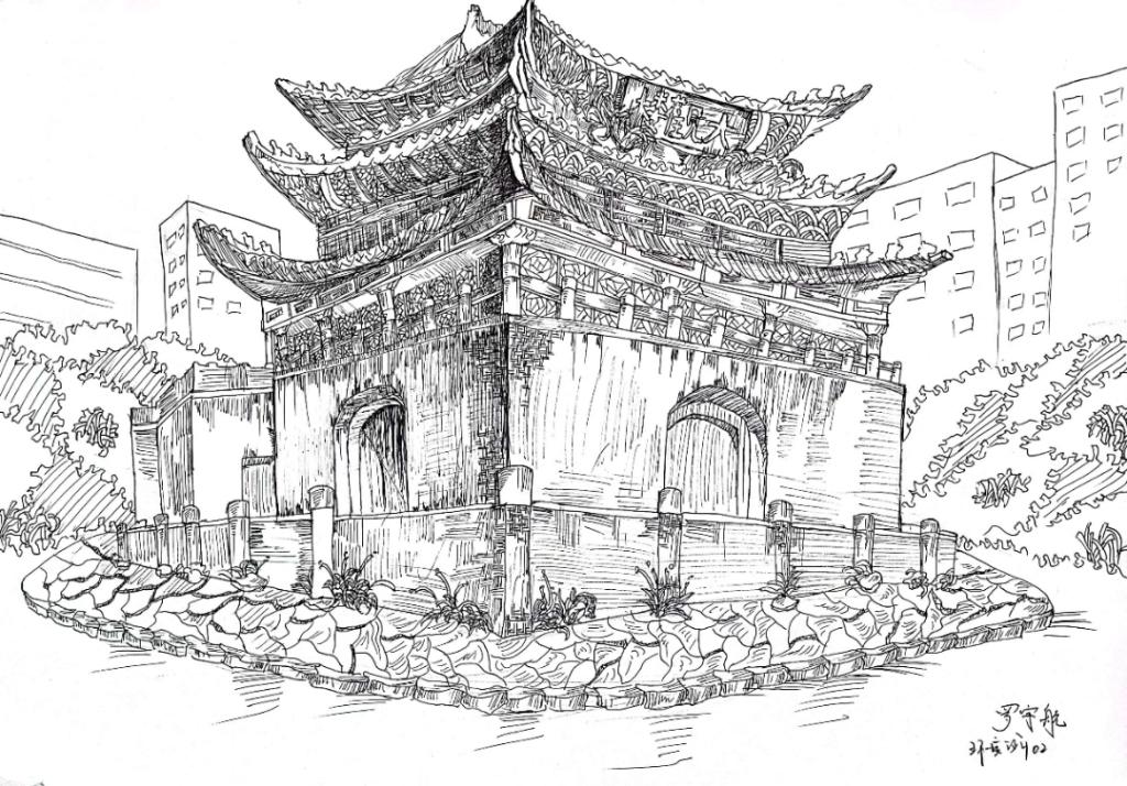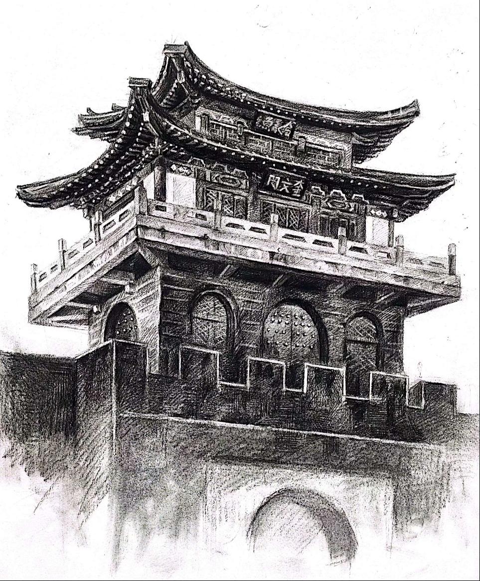 我的家乡潍坊,南邻沂蒙山,北靠渤海湾,钟灵毓秀,万紫千红。想必大家对潍坊的了解一定是从风筝之都这个美称而来的,在潍坊的广场上,五彩缤纷的风筝飞舞在湛蓝的天空,成千上万条丝线承载着五湖四海的热情,渲染出潍坊的勃勃生机。我所绘画的是潍坊的奎文门,它是潍坊明代建筑,是潍县东关城门之一。现存的奎文门是1988年修复的,奎文门三层上书鸢飞鱼跃四字,下有奎文门三字,隔河与文昌阁相望,遂命为奎文门以振文风。