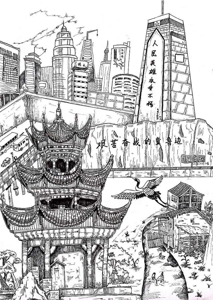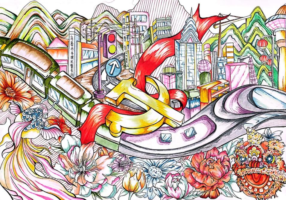 本画描绘的是我的家乡,新疆首府乌鲁木齐,图正中心是党徽,象征着在党的指引下,党的光辉照耀下,乌鲁木齐10年间发生翻天覆地的变化,红丝绸标志着在丝绸之路的建设下,新疆乌鲁木齐正快速发展,以红丝绸为界,左边是乌市十年前,处处是维稳岗亭,绿皮火车,道路交通等基础设施还不够完善,远处黄褐色的山林,也表达出绿化覆盖率低的情况,而丝绸右边,是十年后的现在,摩天大楼,高铁动车,绿荫葱葱,充分展现现今乌市的各项发展迈上了新台阶,时间列车的下方,以新疆特有的天山雪莲,象征经济发展的锦鲤,中华崛起的雄狮做承托,体现出在党的领导下,我的家乡会越来越好,最后,本画有一个特殊彩蛋,其中斜线背景是新疆维吾尔自治区的地图,所有的元素都创作在新疆地图上,我爱我的家乡!