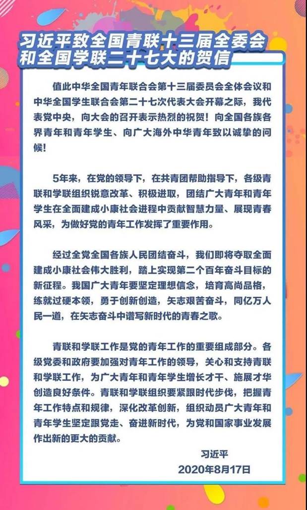 2020年8月17日,习近平总书记为全国青联十三届全委会和全国学联二十七大的召开发来贺电。习近平总书记在信中写到:“我国广大青年要坚定理想信念,培育高尚品格,练就过硬本领,勇于创新创造,矢志艰苦奋斗,同亿万人民一道,在矢志奋斗中谱写新时代的青春之歌。”习近平总书记的贺信,充分肯定新时代青年健康向上、担当作为的精神风貌,对我们青年学生成长成才寄予殷切期望,对做好新时代青联和学联工作提出明确要求。青年一代有理想、有本领、有担当,国家就有前途,民族就有希望。