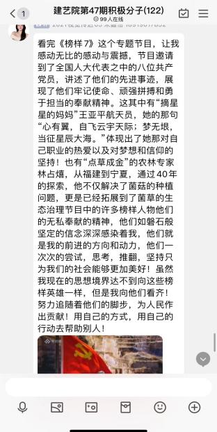 王淑芳:《榜样7》展现了新时代新担当新作为,彰显着我们党的初心和使命,用先进党员的平凡故事诠释了催人奋进的时代担当精神。他们是我们奋斗的动员令、前行的激励书。学习了他们的感人事迹,积极地对待工作和生活。自己作为一名党员教师,坚持教书育人,践行教书者必须先为人师,育人者必先行为示范。