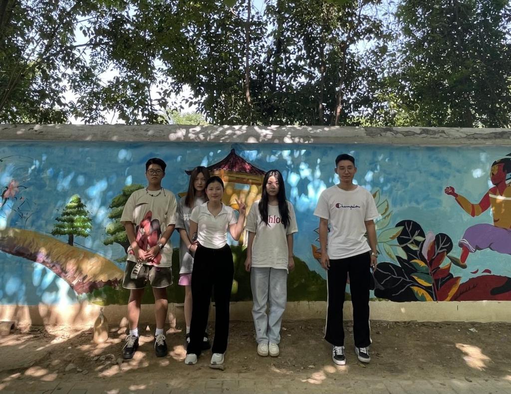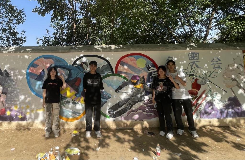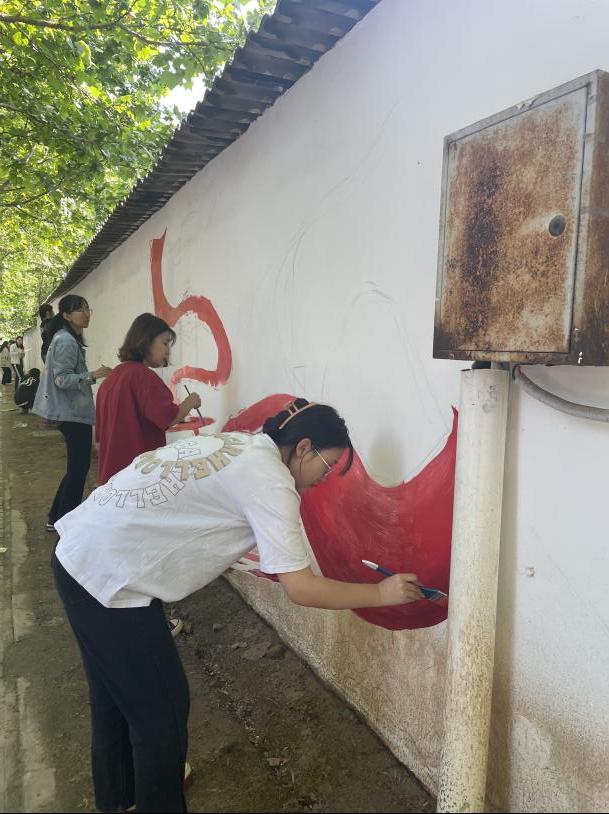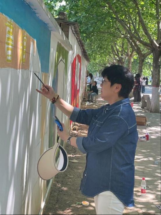 在墙绘现场,我院常务副院长徐莹、党委书记兼行政副院长王飞、党委副书记南斌红、视觉传达设计专业教师周猛猛与同学们共同创作,师生共创,实践成果收获满满。百名师生齐心协力,构图、描图、修整、上色。精心绘制,一幅幅构思巧妙、通俗易懂的墙绘作品跃然墙上。