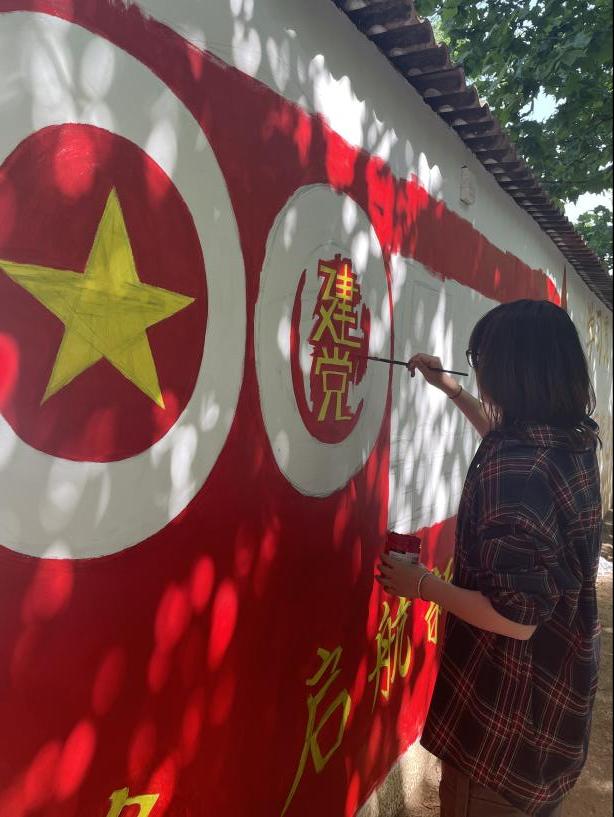 为深入学习贯彻习近平新时代中国特色社会主义思想,学习宣传贯彻党的二十大精神,落实立德树人,深入开展劳动教育、营造以美育人、以美化人、以美培元的校园环境,进一步丰富校园文化生活,营造浓厚的校园文化氛围,依托“一院一品”特色活动,持续推进艺术项目进社区,推动“一站式”学生社区综合管理,在西安培华学院党委宣传部、校团委、后勤服务中心的大力支持下,建筑与艺术设计学院党委组织学院艺术专业教师及学生精心设计“学习二十大、永远跟党走、奋进新征程”主题墙绘。2023年5月13日-5月14日,建筑与艺术设计学院青年志愿者协会在学生社区4号公寓旁落笔完成墙绘。“百位青年”执笔绘“百米长卷”,回首“百年党史”,建设“百年培华”,投身第二个“百年目标”,在中华民族伟大复兴的新征程上展现青春风采!