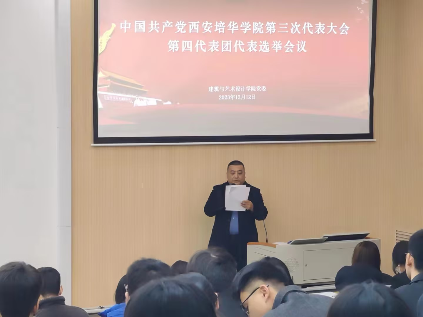 为高举中国特色社会主义伟大旗帜,以习近平新时代中国特色社会主义思想为指导,全面贯彻落实党的二十大精神,按照校党委《关于认真做好中国共产党西安培华学院第三次代表大会代表推荐选举工作的通知》的要求,我院党委于2023年12月12日中午在3505召开党员大会,进行中国共产党西安培华学院第三次代表大会第四代表团代表选举。