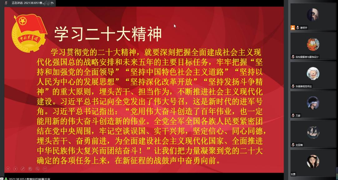伴随着中国共产党第二十次全国人民代表大会的召开,建筑与艺术设计学院团委紧跟党和国家的领导,在学校的统一指导下,观看党的二十大直播,深化同学们的爱国情怀以及价值观的引导。