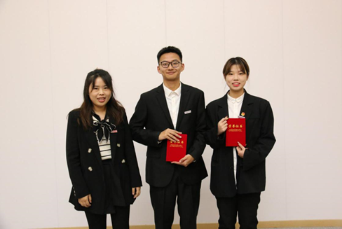 尚淼老师为两位负责人颁发优秀部门奖,优秀部门负责人文豪同学和王可颖同学上台领奖。获奖成员也发布了自己获奖感言,表达自己对工作的热爱态度,并针对新的一学年的工作规划和计划实施做出了简单阐述。