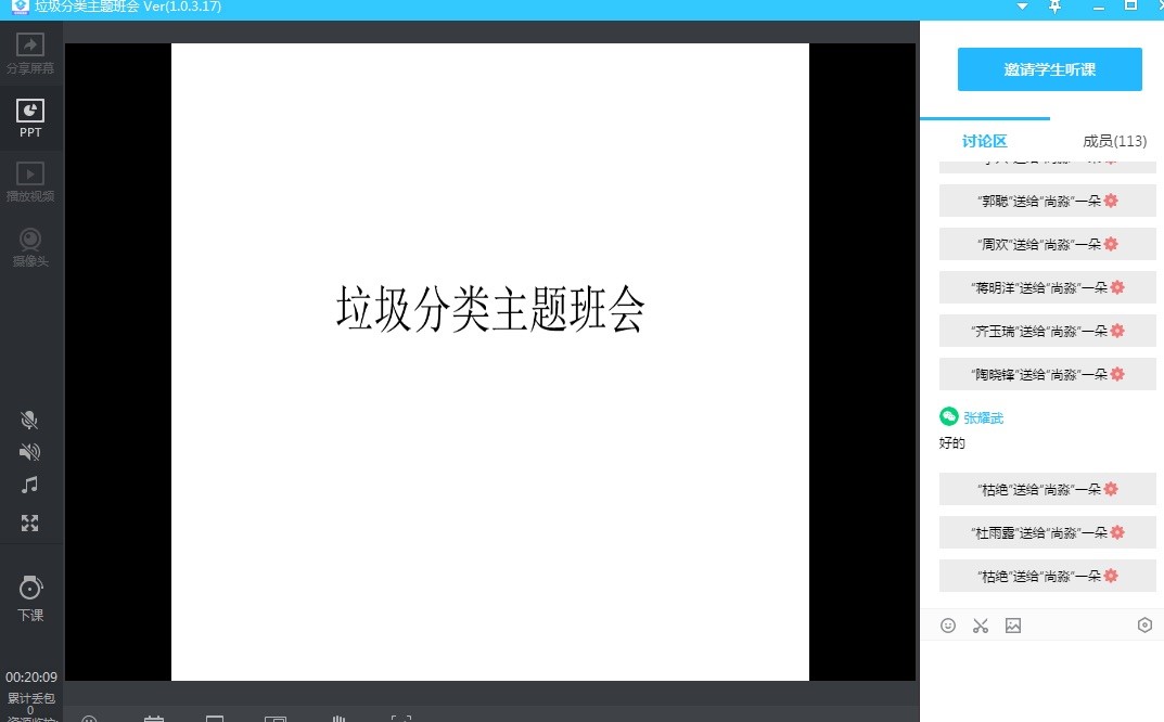 主持人黄译萱同学说:希望同学们都能够认识到垃圾分类势在必行。建议学生干部要积极向班级同学传达垃圾分类的目的并相互监督,带领班级同学做到垃圾文明入桶,共创美好校园环境。