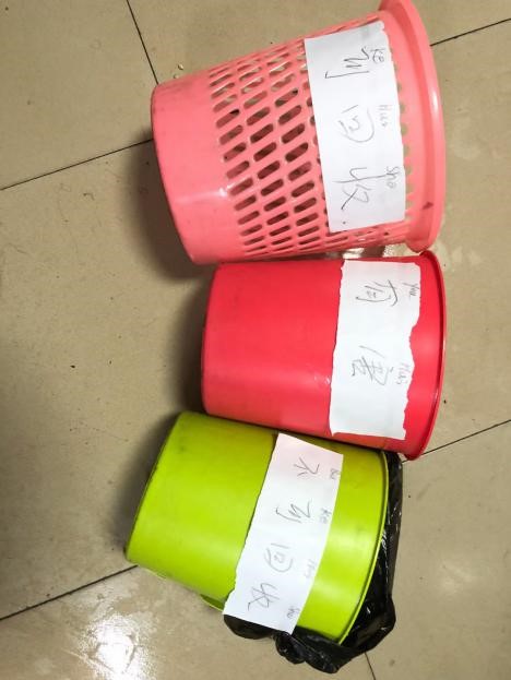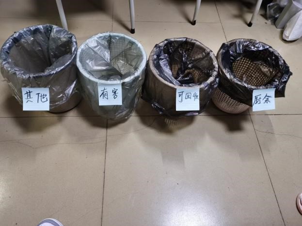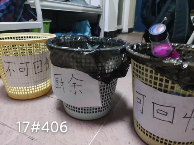 班会结束后,同学们积极参与到垃圾分类中,在宿舍自行对垃圾桶进行类别垃圾分类,同时,对宿舍中的垃圾进行分类。