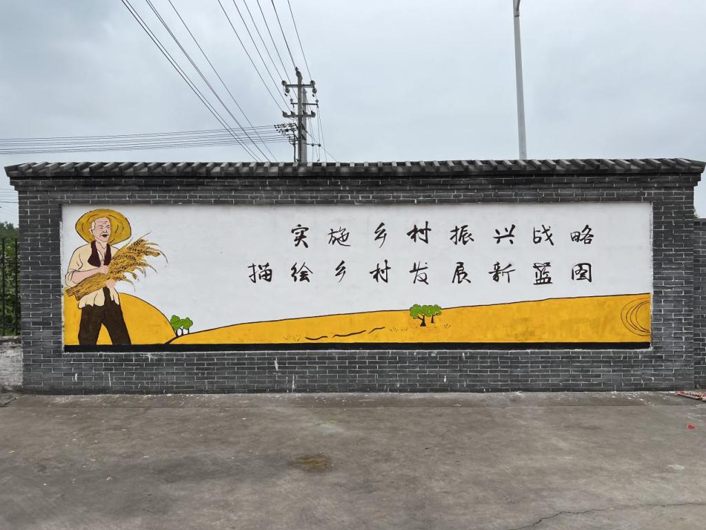 这一副墙绘是乡亲们认为所有作品里最为优秀的一幅,此幅墙绘完成度最高,红色既切合当地革命老区的历史,也代表了乡村振兴新征程上人民的精气神。右上方的党旗也代表着村民的信念和方向标。短短的16个字,是我国乡村振兴战略能够成功的缘由,也是人民对美好生活向往奋斗的有效途径。