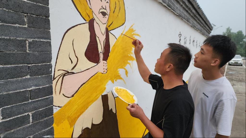 在这段时间里,调颜料、勾轮廓、上色、洗画笔成为我们日复一日不断重复的动作,每天顶着将近40度的高温,忍着农田周边的蚊虫叮咬,如同在攀登高山的旅人,缓步去靠近山顶。虽艰苦,但终有拨云见日的时候,重复着日复一日的枯燥乏味,描绘的却是美好愿景。最终,在历经10天的创作后,我们于7月11日在乡亲们的注目下圆满完成了此次“三下乡”的墙绘任务,得到了当地村民的一致赞扬。