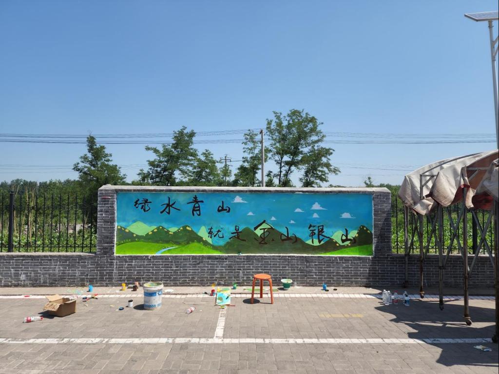 这一幅是最先完成的墙绘,它蕴含着当地在生态文明建设中所付出的努力和生态文明观念的转变。十年前,当地的生态环境较为恶劣,庄稼耕种不便,道路尘土飞扬。在党的十八大之后,当地开展了生态文明建设和环境治理,十年间,当地生态环境有了翻天覆地的变化,家家户户整齐规划,道路平整,河水清澈。在这些美好景象的背后,就是这一句具有划时代意义的生态理念——绿水青山,就是金山银山。