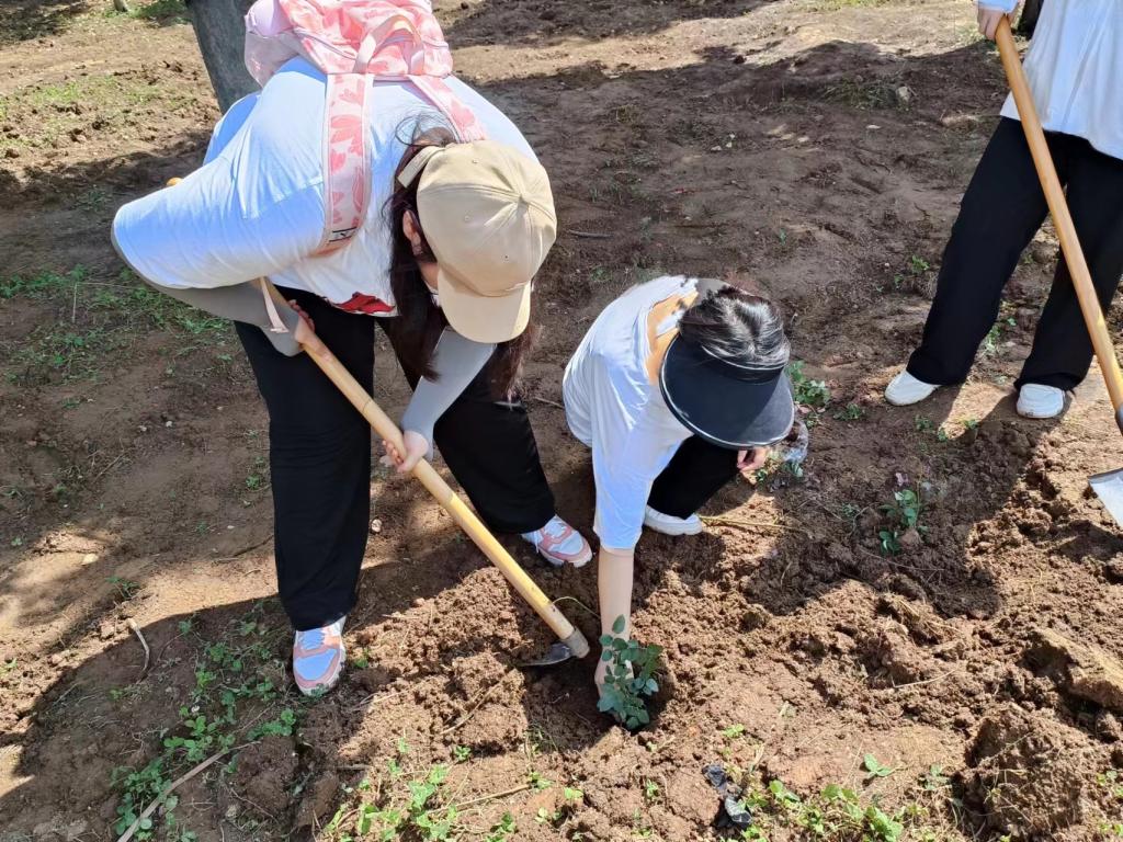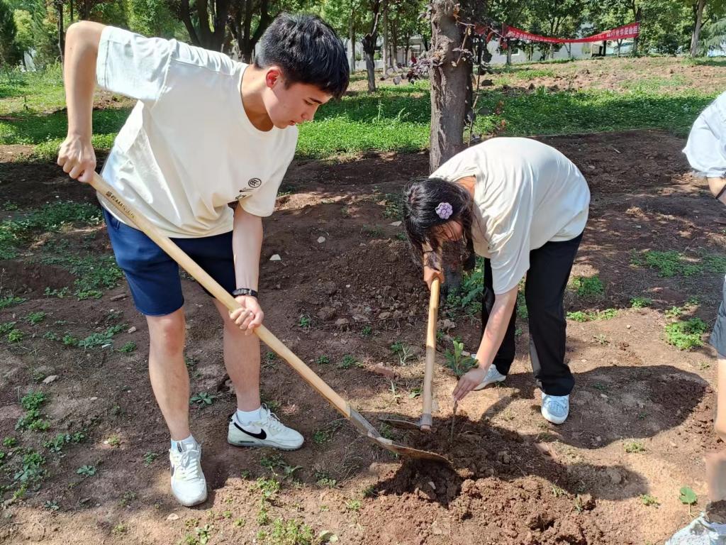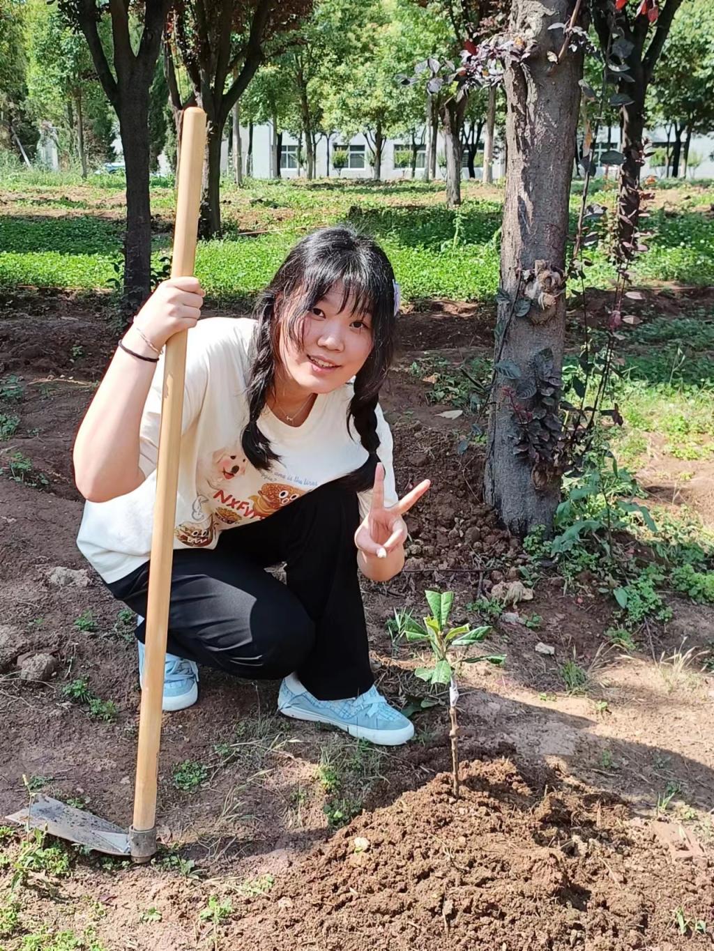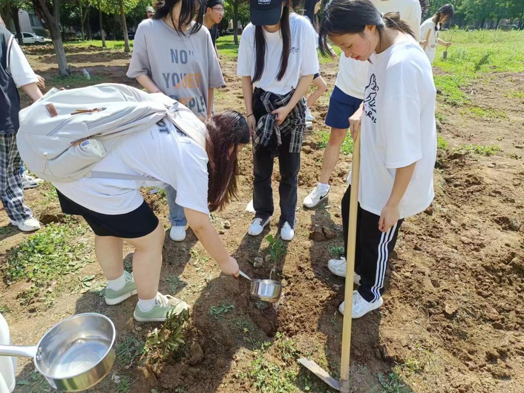 辅导员吕文静老师带领大家到达指定区域后讲解种树的步骤,指导和陪伴大家挖好每一个坑,培好每一锹土,植好每一棵树。同学们撸起袖子,相互配合,在劳动基地热火朝天地进行锄地,挖坑,扶苗,浇水等步骤,在大家的共同努力下,共有30多株树苗在劳动教育基地安家。在活动期间,同学们井然有序,干劲十足,都以积极热情的态度和实际行动来参与这次活动。