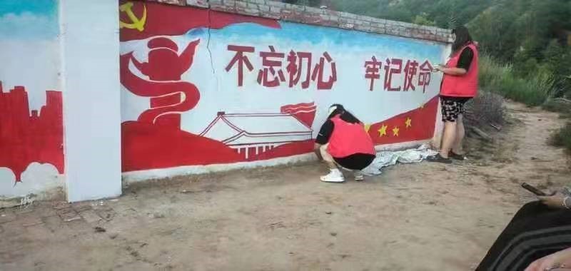 到达画墙绘的地方后同学们根据墙面的大小完成初稿设计。接下来同学们分组合作,明确分工。用粉笔在各面墙上勾勒出清晰的轮廓,随后同学们调配出符合画面需求的颜色,均匀的涂在墙面上。骄阳似火的盛夏,清脆悦耳的知了声,实践队员们热情高涨,战高温、斗酷暑。每个人都坚持不懈,肯吃苦不抱怨的完成各自的任务。以丙烯、画笔为绘画材料,精心设计,对徐家沟墙面乡土文化、乡村振兴等内容的宣传以绘画、标语的形式绘到墙面,向村民倡导着不忘初心牢记使命的价值观。