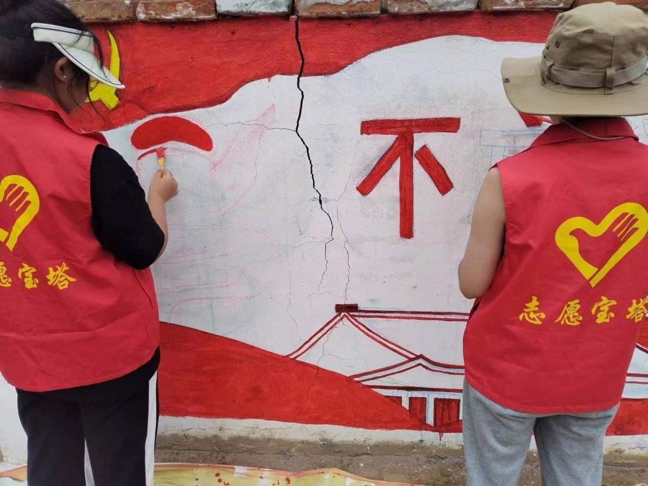 中国青年网延安7月13日电(通讯员 强思雨 孟科妍)为深入贯彻党的十八大、十八届三中全会,进一步推进生态文明和美丽中国建设。为改善农村人居环境,加强农村文化建设,为新时代乡村建设添砖加瓦。今天,西安培华学院建筑与艺术设计学院“艺术为家乡赋能,乡村展开新画卷”暑期三下乡社会实践团队逐渐步入正轨,早上十点半从村民家里出发,穿上当地志愿者马甲,手拿画笔刷子,带上颜料开始一日的墙绘工作。