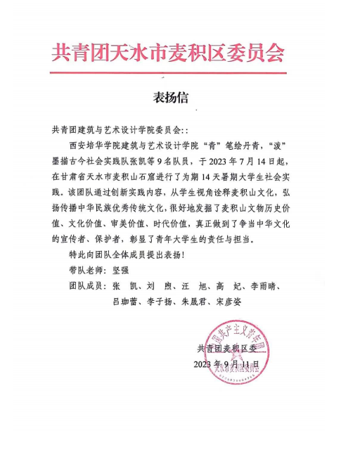 为弘扬优秀传统文化,深入推进物质文化遗产的保护与传承,西安培华学院建筑与艺术设计学院三下乡实践队于2023年7月13日至7月18日在天水市麦积山石窟开展了为期15天的“青笔绘丹青,泼墨描古今”活动。活动通过艺术绘画的方式,展示和传承中华文物的独特魅力,激发青少年对中华文化的兴趣和热爱传承中华文化:中华文物是中华民族的瑰宝,承载着丰富的历史、文化和艺术内涵。实践队受到表扬2次,调研报告3篇,成果册1份,各类社会报道12次,心得体会8篇,宣传视频3个。