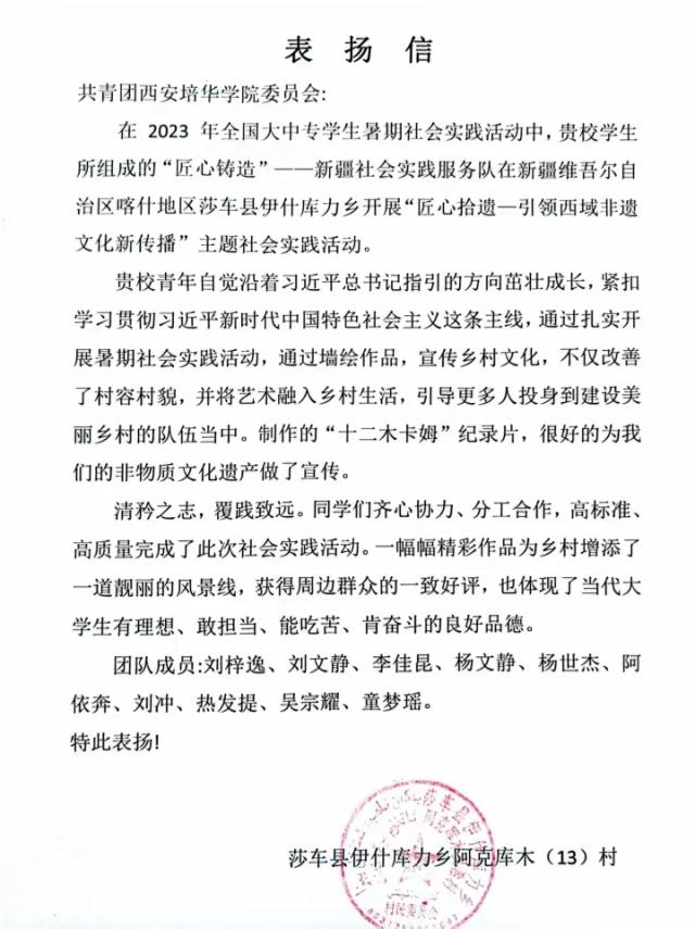此次实践活动,实践队共完成 60+米的墙绘绘制,“匠心物语”系列 IP 和文创产品,关于“十二木卡姆”非物质文化遗传宣传片一份,调研报告两篇,成果册一份,各类社会报道三十余篇,队员心得体会 10 篇。
