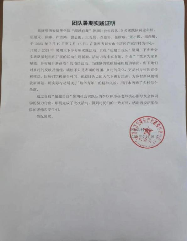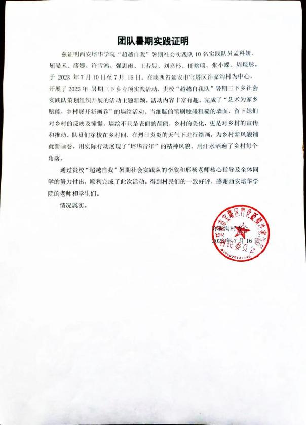 社会调研报告完成2篇。调研报告两篇,成果册一份,各类社会报道二十余篇,队员心得体会 12 篇。志愿者们不忘初心,牢记使命,始终坚持展现培华青年的精神风貌与专业素养,用自己手中的画笔为这个美丽的小镇添上一笔亮丽的风景线,也为建设新农村和乡镇旅游添砖加瓦。