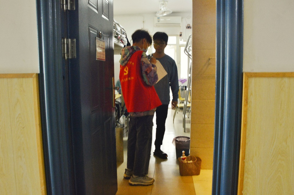 检查过程中,检查小组对疫情期间积极参加公寓志愿活动的同学进行了慰问。检查小组详细了解了志愿者储备、值守轮换、后勤保障等工作情况。认真询问志愿者们的工作开展情况和工作中遇到的困难,鼓励大家继续坚守好各自岗位,做好自身防护。同时,对疫情防控期间学生志愿者们“逆行”而上、挺身而出的勇气和毅力表示赞扬与肯定,表示志愿者们用实际行动展示了青年学生的担当精神,彰显了我院学子的优良风貌,并鼓励大家将这种默默无闻的奉献精神继续发扬下去