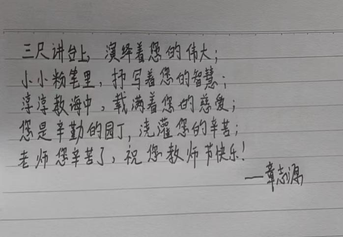 “心血育桃李,辛勤扶栋梁”,今天是教师节,同样也是中秋节。老师们的诲人不倦,无私奉献的精神滋养着我们。这种无私、伟大的爱给我们温暖和力量,促使每一个学生实现自己的梦想,到达胜利的彼岸。祝老师中秋节快乐,教师节快乐,双重快乐。