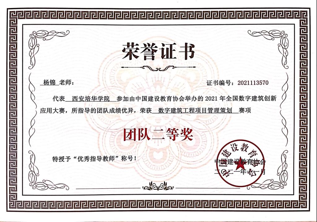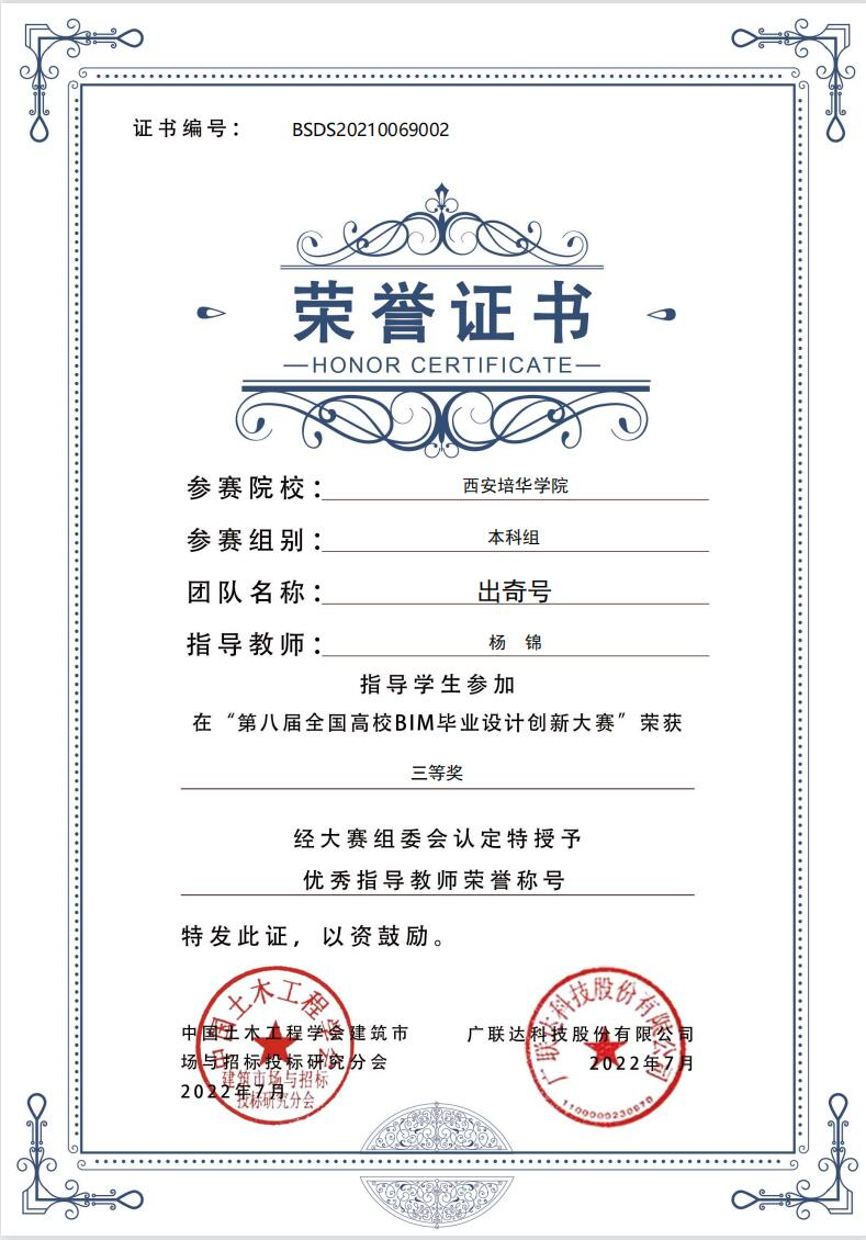 在教学之外,杨锦老师积极参加专业相关课题及项目,发表实用新型专利《一种建筑工程管理用工程进度展示装置》;参与陕西省教育科学“十四五”规划2021年度一般课题《工程教育专业认证背景下高校土木工程专业课程思政建设研究》项目立项工作;参与校级重点科研项目《钢筋混凝土仿古建筑大屋盖梁架体系抗震设计关键技术研究》结项;指导学生在《第八届全国高校BIM毕业设计创新大赛》、省级大学生创业项目等多项赛事中斩获佳绩。