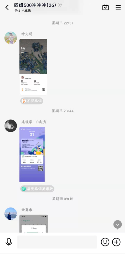 为了准备12月的四级考试,他们于7月初成立英语打卡小组,坚持每天背英语单词,如果21天可以养成一个好习惯,那么他们已然带着好习惯去冲刺自己的四级目标。