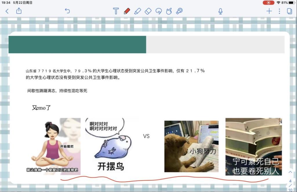 之后,郝甜甜老师和学生讨论这些现象出现的原因,有学生提到,因为初入大学,大家有了更大的自由,同时也出现了迷茫;有学生提到,因为大家是在网络发展中成长起来的,习惯了虚拟世界的生活,在现实中往往有社交恐惧症;也有学生提到,大家表面在“摆烂”,但实际上,因为大学依然有成绩要求,有评奖评优的压力,所以还是会“卷”起来。