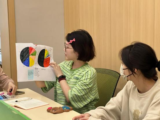王旭老师首先讲解了生涯概念并解读了生涯彩虹图,然后引导同学们寻找自己当前当下所扮演的角色-计算角色时间分配-绘制饼图,再根据当前饼图启发思考每一项角色时间分配是否合理,再重新去绘制理想饼图,并思考记录下完成理想饼图需要做哪些努力。同学们在分享中纷纷表达了根据饼图的绘制,发现了目前时间使用的不合理,重新梳理了自己的时间分配。