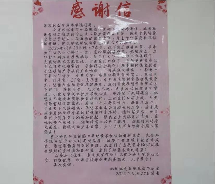 近日,一位在红会医院就诊的患者给西安培华学院发来感谢信,特别感谢我校建筑与艺术设计学院工程造价1902(专)班的雷杨舟同学,信中详细介绍了其在红会医院帮助陌生患者的好人好事事迹,让人深受感动,为助人为乐的雷杨舟同学点赞,为我校能有这样品德高尚的好青年点赞。
