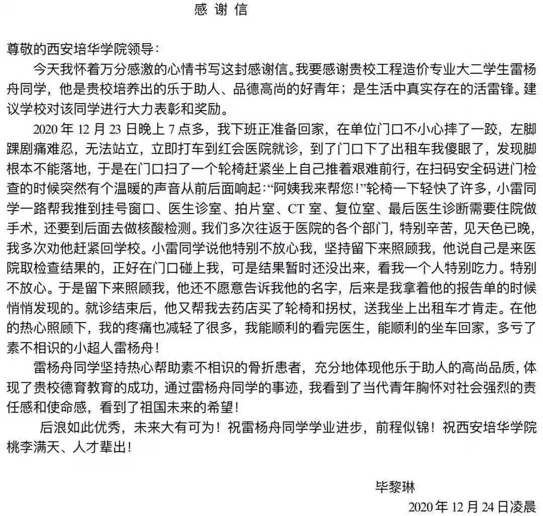 信中表示,雷杨舟同学不仅主动帮助这位素不相识的阿姨,推着阿姨往返医院多个部门,协助阿姨挂号、就诊、拍片等,还因不放心阿姨一个人,坚持留下来照顾就诊的阿姨,待阿姨就诊结束、顺利坐上车之后才离开返回学校,雷杨舟同学的行为生动诠释什么是助人为乐,也为患者在寒冬中带来一丝温暖。