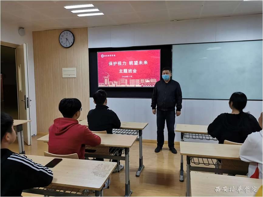 根据《陕西省综合防控儿童青少年近视实施方案》、《陕西省教育厅办公室 陕西省卫生健康委员会办公室关于开展近视防控宣传教育月活动的通知》等文件要求,我院于2020年11月1日在格物楼召开“保护视力 眺望未来”主题班会。
