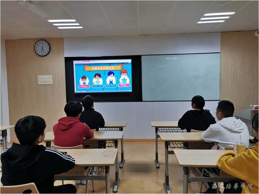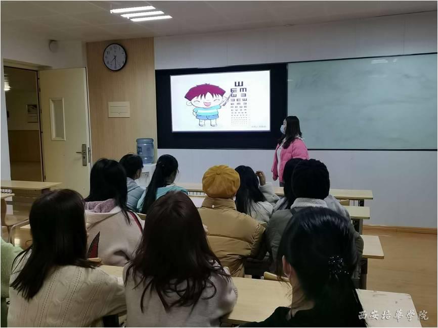 辅导员结合生动有趣的图片向学生详细讲述了近视给学习和生活带来的不便,提醒同学们平时适度使用手机,注意写字和学习时的坐姿,保持充分休息和适度体育锻炼,养成良好的用眼习惯。