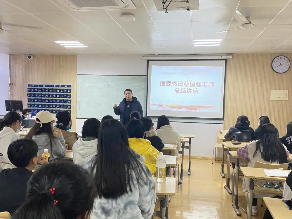 团委书记蔡国强老师要求全体团学青成员学习和落实做到以下几点:1.要坚持党的领导,坚定理想信念,坚持马克思主义理论指导。坚持不忘初心、牢记使命,增强“四个意识。”2.要坚持“人民至上”。把人民利益放在第一位。提高人民群众的获得感、幸福感、安全感。3.要坚持“收官”与“开局”同步,抢抓机遇、埋头苦干、认真努力,全面完成各项目标任务,同时要谋划未来工作,力争每年团学青都有新的突破。