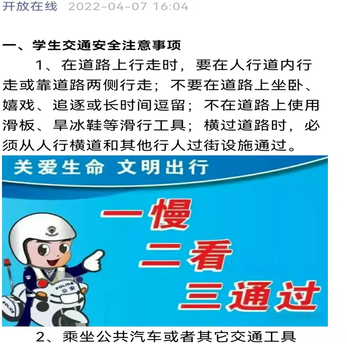 此次活动通过线上线下途径进行大力宣传,在宣传栏张贴交通安全海报,提醒学生重视交通事故,保护自身安全;同时利用我校微信公众号及校园官网发布交通安全相关文章,加大此次安全教育活动的宣传力度,快速而有效地提高师生对于交通安全的重要认识,达到保护师生生命安全的目的。