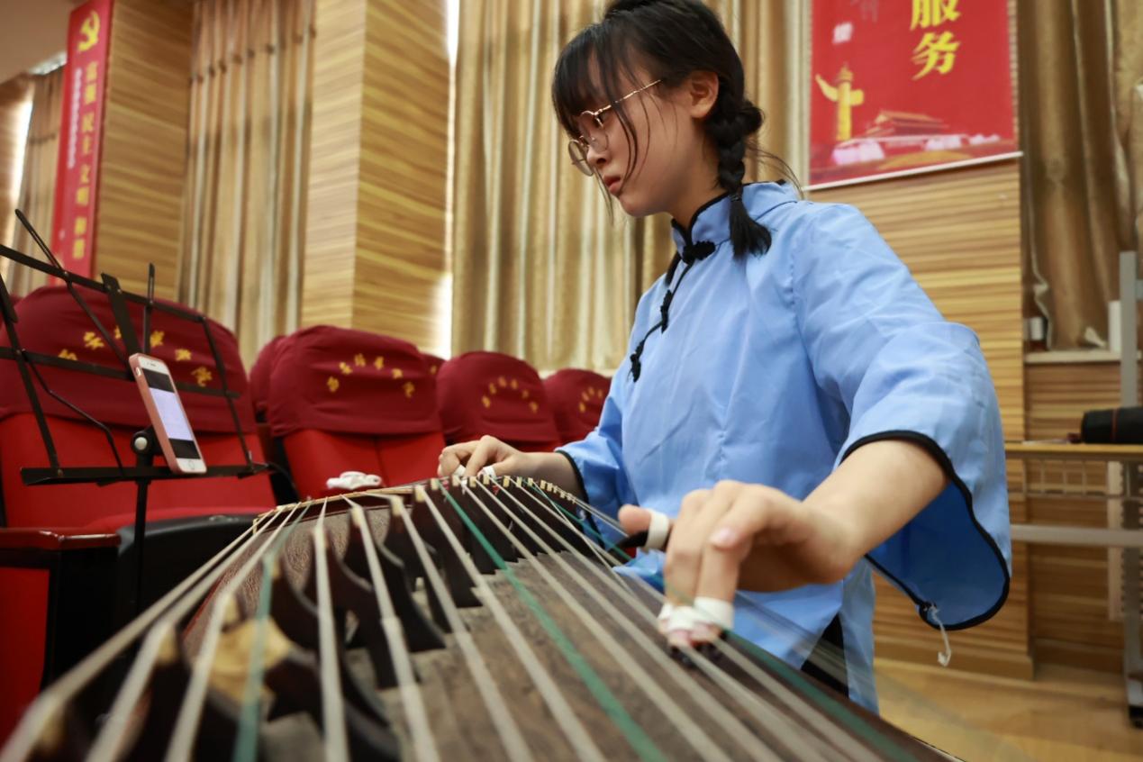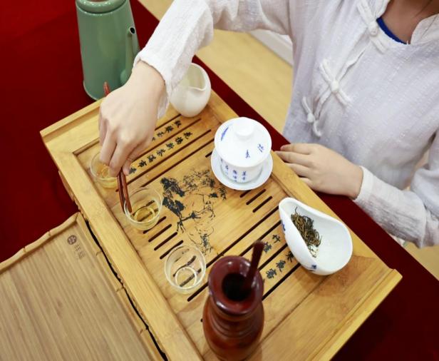 茶艺表演展示的同学们动作纯熟优雅,展示“迎客礼”、“茶盘茶具展示”、“盖碗茶展示”、“红茶鉴赏”、“敬茶品茗”等内容,投茶、高冲、闷茶、闻香等动作一气呵成,配上高凯璇同学的古筝独奏,俨然一幅充满诗意的水墨画。