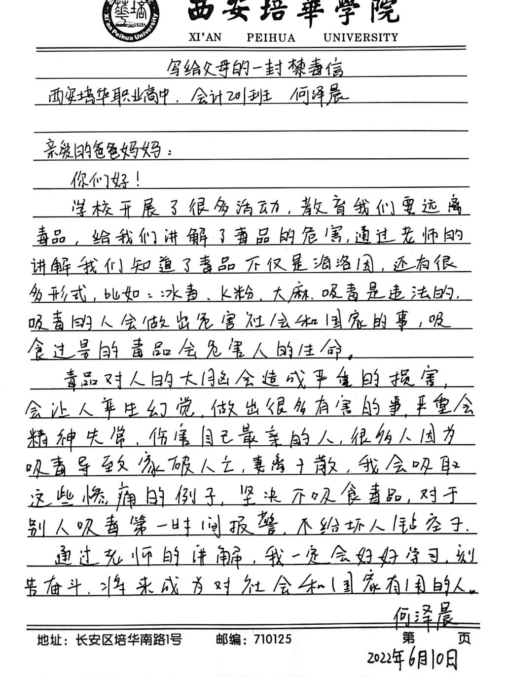 为了引导家长重视禁毒工作,我院组织开展了“写给父母的一封禁毒信”活动,组织学生把自己对于毒品的危害和拒绝毒品的决心写成信件交给父母,形成禁毒防护的有效闭环,确保此次禁毒专题活动的效果落实到位。