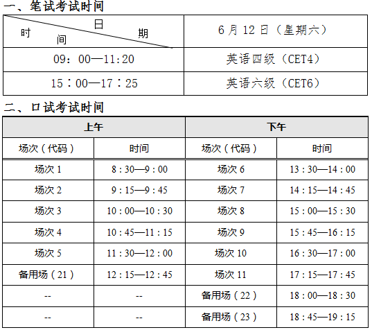 根据教育部考试中心的安排,2021年上半年全国大学英语四、六级考试笔试和口试将分别于2021年6月12日和5月22至23日进行,本次采用全国集中网上报名方式,报考语种有:英语四级、六级;考试时间及报名程序如下: