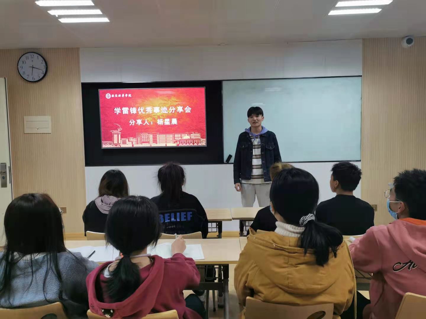 我校邀请了在疫情期间表现突出并获得“学雷锋先进个人称号”的杨星晨同学分享自己助力疫情防控的先进事迹和感人故事。在疫情期间,杨星晨同学作为志愿者分别前往延安市消防大队和延安市长庆社区协助开展疫情防控工作,为消防器材进行消毒,为社区空巢老人配送饮用水,身体力行践行雷锋精神。