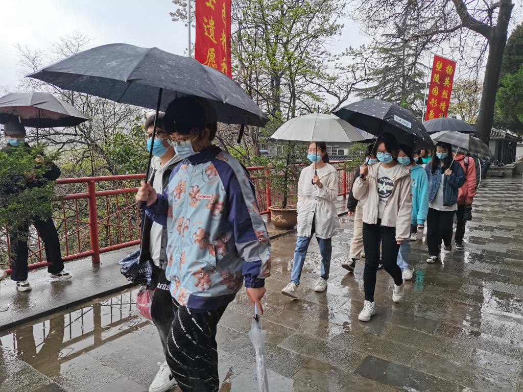 虽然天空中下着瓢泼大雨,但依旧抵挡不住学生们祭奠英烈的脚步。上午十点,同学们按照计划集合完毕后,统一乘坐大巴前往杨虎城将军烈士陵园。