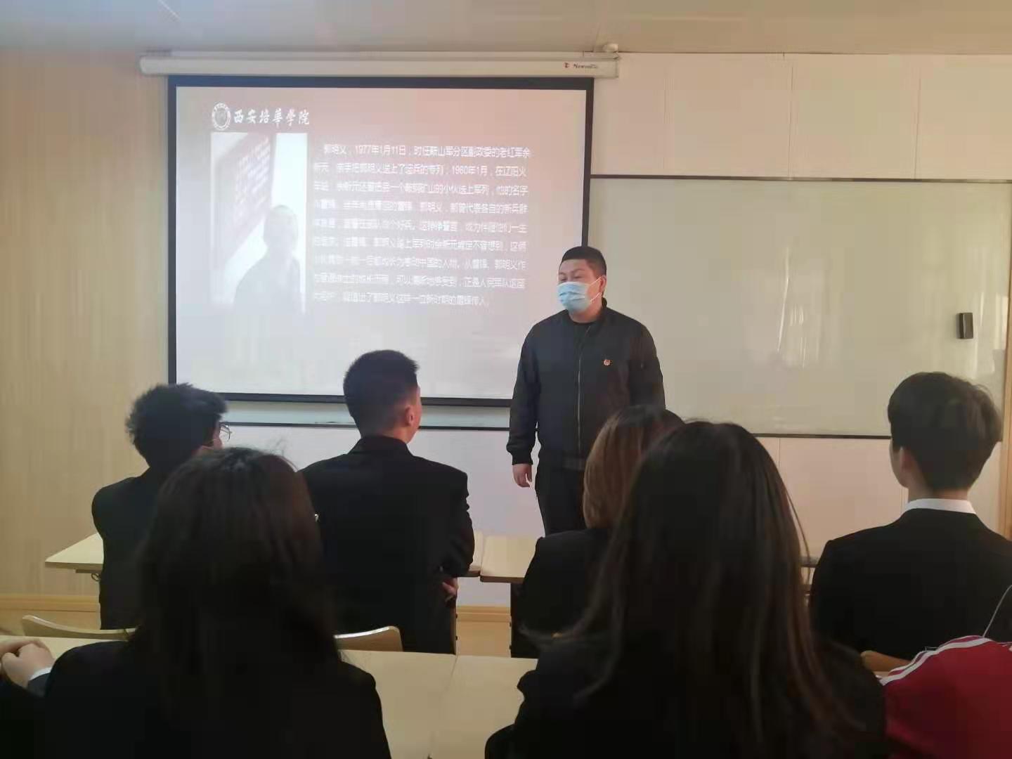 我院分团委书记蔡国强讲述了优秀党员郭明义的故事,郭明义四十多年如一日学雷锋做好事,时时处处发挥共产党员的先锋模范作用,被人民群众誉为“爱心使者”“雷锋传人”。郭明义作为“雷锋精神”的优秀传承者,无论在什么岗位上,无论做什么,他都兢兢业业、任劳任怨,干一行爱一行、钻一行精一行。郭明义以"爱心"和"奉献精神",呼唤着人类朴实情愫的回归,呼唤着民族道德观念的进步,呼唤着人类的新文明的发展,呼唤着我们民族的振兴和祖国的腾飞。