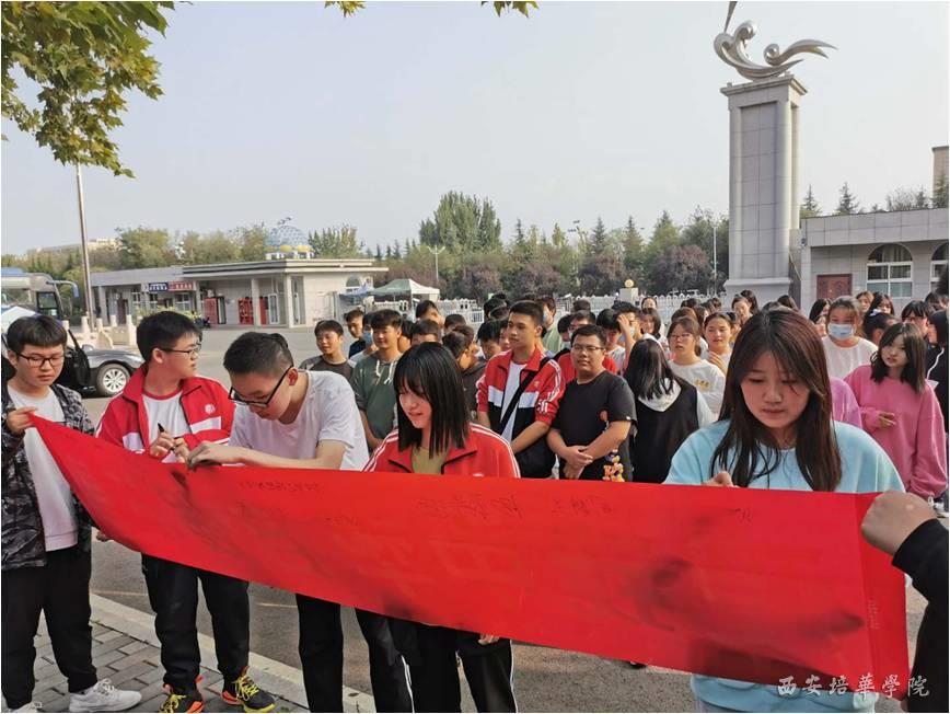 升旗仪式结束后,学院举行了爱国主义签名活动,同学们踊跃参与,纷纷在爱国教育横幅上签字,表达自己的爱国之情。