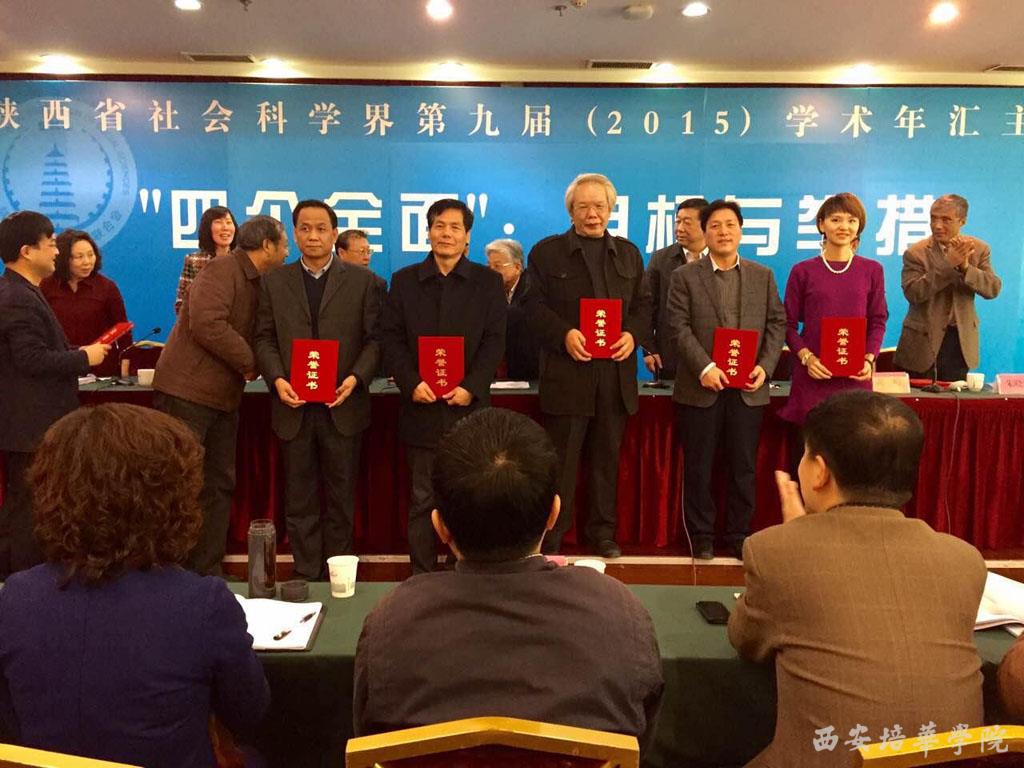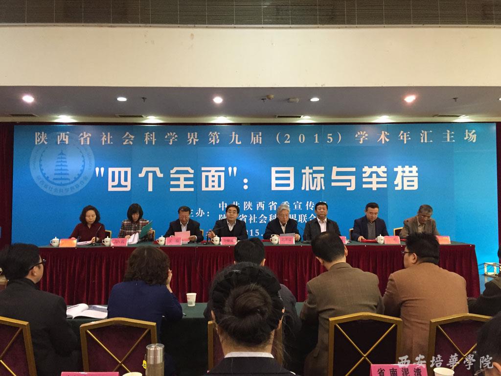 本届学术年汇主场活动以“四个全面:目标与举措”为主题,前期已经举行了持续两月有余的多个专题性分场活动,因此会议开始后,学术年汇分场活动的几位报告人首先对各分场学术研讨情况进行了简要汇报。主要围绕着十八届五中全会精神的学习领会,结合新常态下我省经济社会发展的实际情况,分别对全面深化改革、全面建成小康社会、全面依法治国、全面从严治党的专题研讨进行了总结汇报。接着,举行了陕西省社科界第九届学术年汇优秀论文颁奖仪式,省委宣传部副部长钟顺虎和省社科联领导亲自为获奖作者代表颁发荣誉证书。我校喜获两项奖励,分别为王西安教授的《地方高校转型发展中的“三热三冷”问题及其破解对策》、原亚丽老师的《丝绸之路经济带视角下西安市对外贸易发展对策研究》。随后,钟顺虎副部长发表重要讲话,对全省社科工作者提出三点要求:第一,把握正确方向,坚持用中国理论阐释中国实践;第二,突出问题导向,坚持用陕西精神破解陕西难题;第三,勇当敢为,坚持用陕西力量提升陕西形象。最后,省委政策研究室副主任蒋录祥结合党的十八届五中全会精神及省委“十三五”规划《建议》作了主旨学术报告。