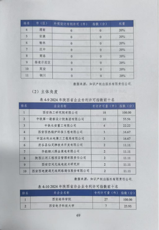 西安交通大学知识产权研究中心、北京智慧财富知识产权金融研究院有关专家现场发布了《陕西省知识产权人才发展报告》(2024)、《陕西省专利转化运用指数年度报告》(2024)。其中在转化运用指数报告中统计:2024年陕西省非企业专利许可指数前十名: