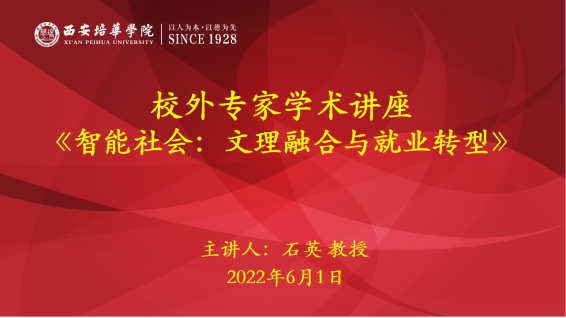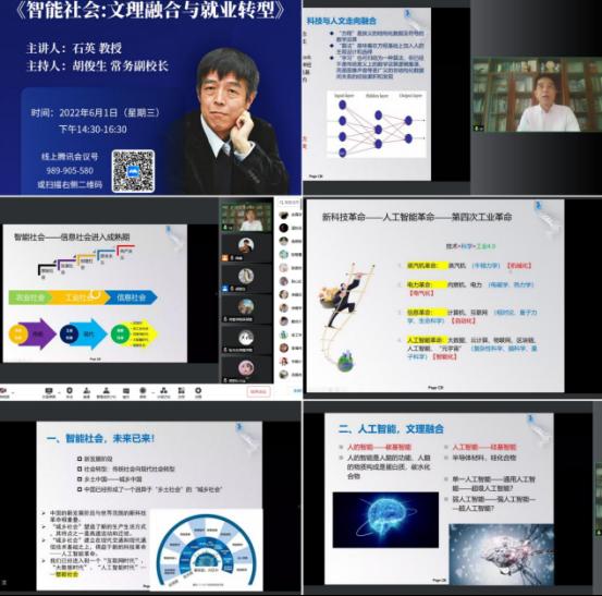 为了进一步丰富学生理论知识,拓宽学生视野,充分发挥“学术讲座”在培养学生人文素质教育方面的作用,6月1日下午14:30-16:30,教务管理中心组织校外专家石英教授为学生进行了以《智能社会:文理融合与就业转型》为主题的学术讲座活动。参加讲座的有常务副校长胡俊生、各学院教师及学生代表近300人。讲座由常务副校长胡俊生主持。