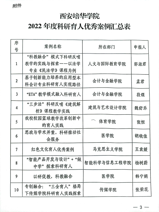 为进一步落实人才培养的中心地位,创新科研育人方式方法,构建产学研协同育人的新格局,充分发挥科研在人才培养中的作用,促进应用型人才培养质量的提升,提炼科研育人的经验。教师们坚持积极推进科研成果进课堂,会计与金融学院孟君老师的《基于创新能力培养的应用型本科会计专业科研育人实现路径》、建筑与艺术设计学院魏舒乐老师的《“三步法”科研反哺<建筑解析>课程教学实践》、医学院韩宁娟老师的《以研促教,科教融合》等十个案例被评选为科研育人优秀案例。