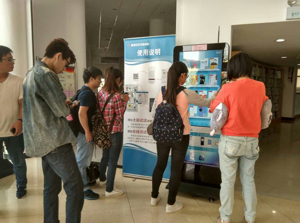 在图书馆大厅两侧各有一台歌德电子书借阅机,扫码即可安装超星移动图书馆。歌德是一款纯自动电子书籍借阅机,拥有智慧型自助借阅系统,并首创24小时电子书借阅服务概念。电子借阅机内预装了3000册独家授权的正版图书,内容涵盖精品推荐、经典名著、生活保健、经管理财、成功励志、小说传记、政史军事、文学艺术、科学技术、社会法律、哲学宗教、亲子育儿等方面。同时,图书与出版社纸质书籍同步发行,每月更新150册图书。