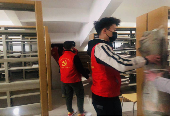 图书馆三楼过报阅览室的清理工作是一项比较的繁重、辛苦的劳动,传媒学院“党员先锋队”的同学们首当其冲,不怕苦不怕累,借助手机电筒,一捆捆一摞摞,认真清理书库隔断的包装纸,甚至到细小角落的垃圾也都清理到位。整理书架的同学们怀着认真谨慎的态度将图书馆中厅区域的图书整理得井然有序,整个活动期间为了不打扰到在图书馆自习的同学,志愿者都特别注意轻拿轻放图书。