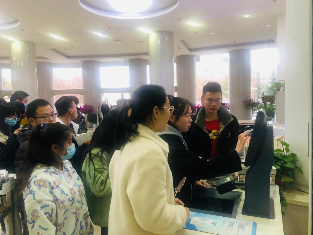 随后,办公室王老师带领新来员工及实习生,对图书馆前台基础借还服务工作及各楼层库室进行实地操作、参观交流,以加深新来老师和实习生对馆藏布局的了解。